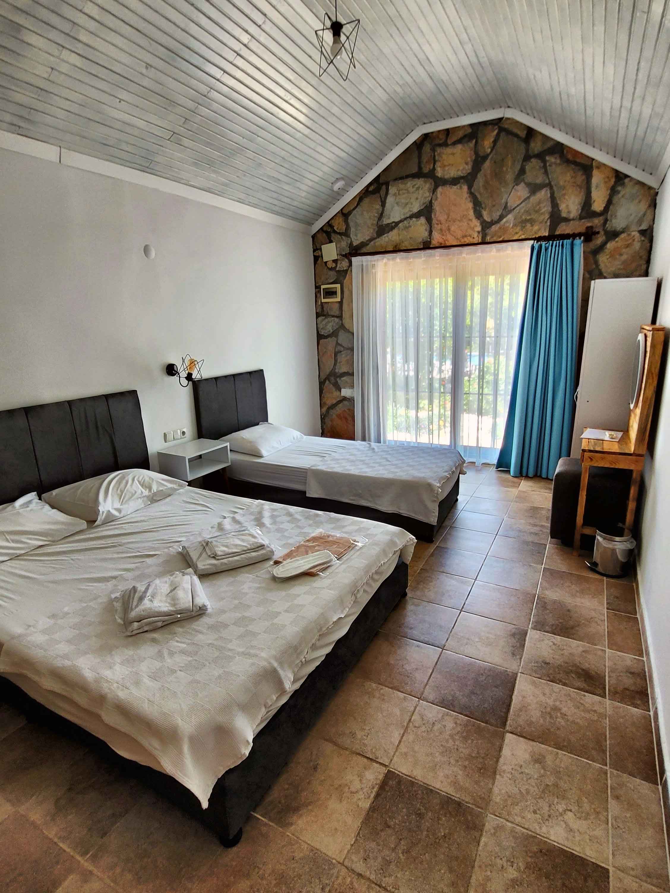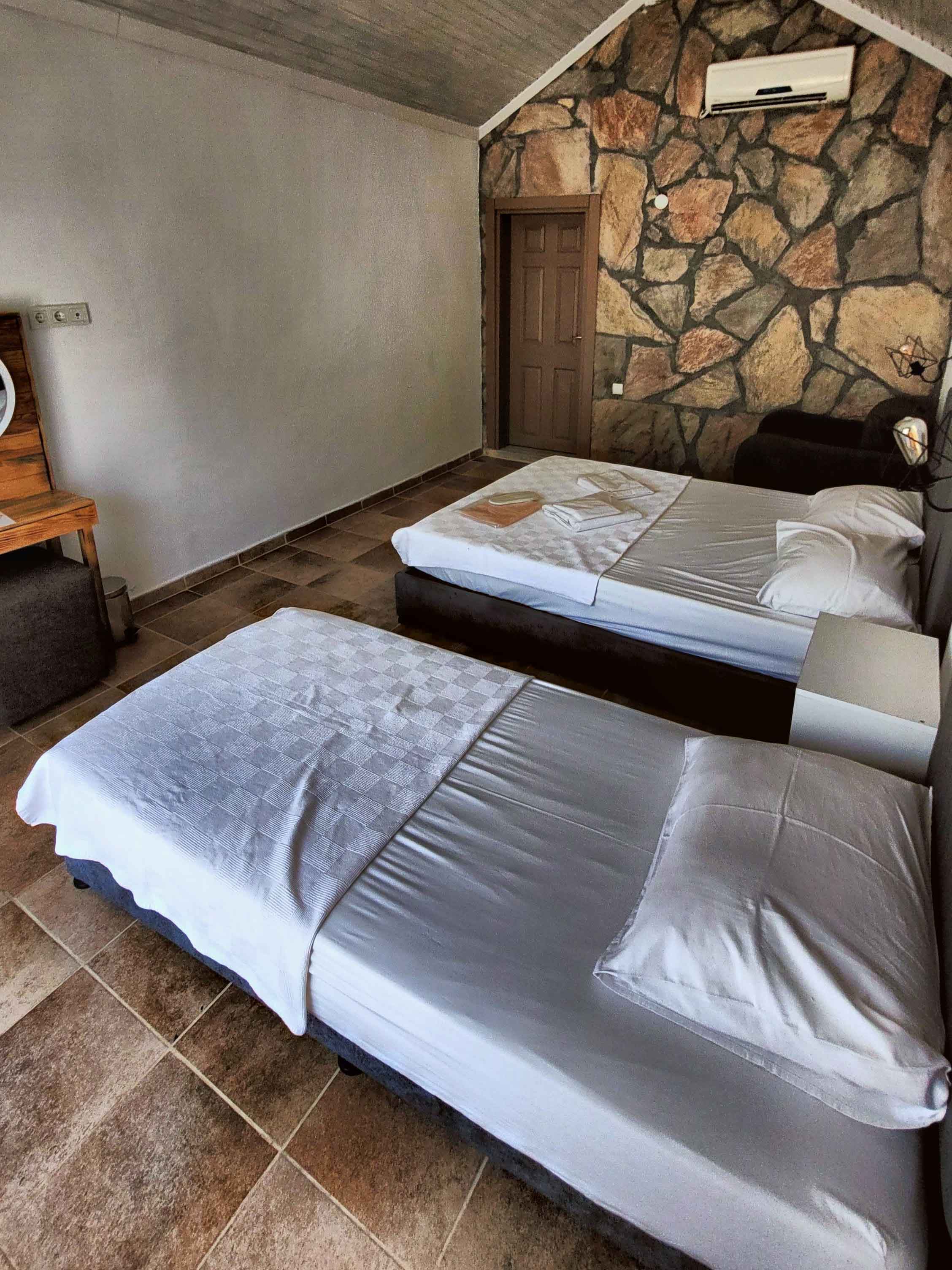 6 adet yan yana konumlandırılmış taş odalardan oluşmaktadır. 21 m2 genişliğe sahip odalarımız 3 veya 2 kapasiteli olup, kapasitesine göre 1 çift kişilik ve 1 tek kişilik yatak bulunmaktadır.
